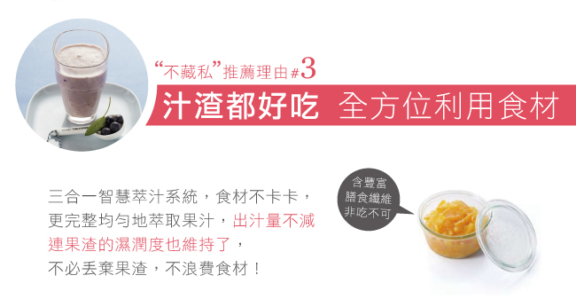 首創世界專利由三合一智慧萃汁軸低溫旋轉擠壓原汁,解決因使用傳統快速刀片果汁機造成大量空氣混入及必須加水攪打所容易產生的果汁分離和快速氧化,不僅能享受無添加的原汁美味,操作更簡單,連清洗收納也變輕鬆了!